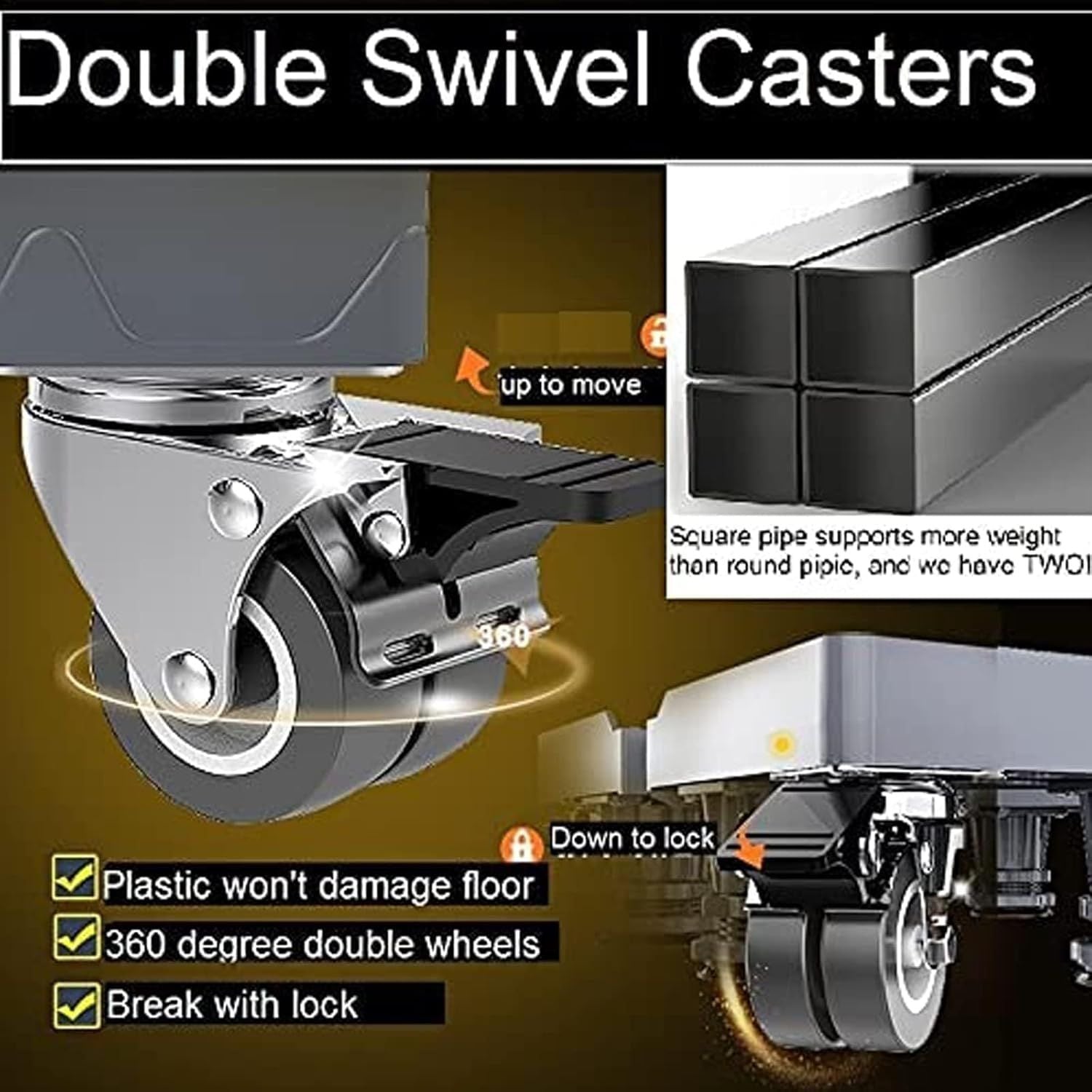 • Wheels: 4 heavy-duty swivel caster wheels (2 with brake lock)